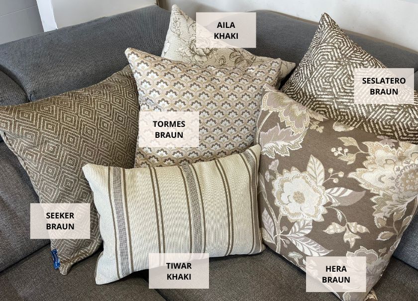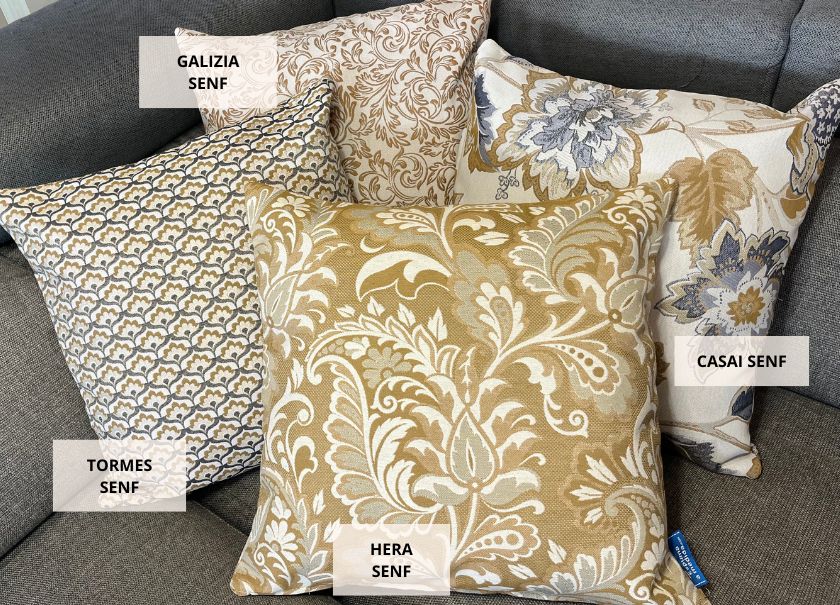 Florale Muster und Jacquards in Erdtönen, Ocker- und Burgundnuancen verbinden sich harmonisch mit uni- und Halbuni-Stoffen und schaffen so ein stilvolles und gemütliches Ambiente.